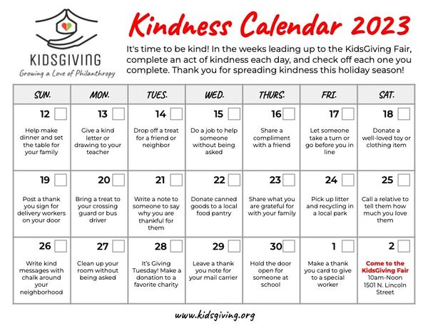 Leading up to the annual KidsGiving Fair, kids are encouraged to complete an act of kindness each day with their family to spread kindness during the holiday season. KidsGiving members may earn credit for completing at least five acts of kindness, in no particular order!